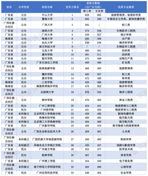 華南地區以廣東省的錄取分數線為例,分為理工類和文史類,其綜合類院校共68所。綜合競爭力排名第一的中山大學錄取分數線分別是629分(理工)和605分(文史),其優質推薦專業是旅游管理類、地理科學類。綜合競爭力排名第二的是暨南大學,該院 校錄取分數線分別是602分(理工)和590分(文史),主要推薦專業是中國語言文學類和新聞傳播類。具體情況如下表所示。