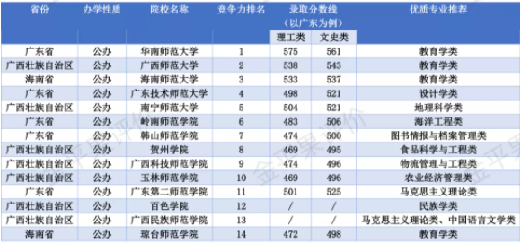 華南地區以廣東省的錄取分數線為例,分為理工類和文史類,其師范類院校有14所。綜合競爭力排名第一的廣東財經大學錄取分數線分別是575分(理工)和561分(文史),其優質推薦專業是教育學類。綜合競爭力排名第二的是海南師范大學,該院校錄取分數線分別是533分(理工)和537分(文史),主要推薦專業是教育學類。具體情況如下表所示。
