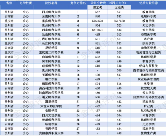 西南地區師范類院校排名情況