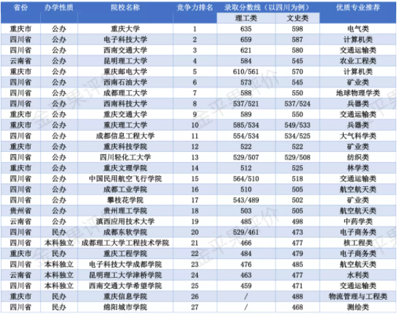 西南地區(qū)以四川省的錄取分數線為例,分為理工類和文史類,其理工類院校共27所。綜合競爭力排名第一的重慶大學錄取分數線分別是635分(理工)和598分(文史),其優(yōu)質推薦專業(yè)是電氣類。綜合競爭力排名第二的是電子科技大學,該院校錄取分數線分別是659分(理工)和587分(文史),主要推薦專業(yè)是計算機類。具體情況如下表所示。