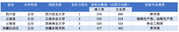 西南地區以四川省的錄取分數線為例,分為理工類和文史類,其農林類院校共4所。綜合競爭力排名第一的四川農業大學錄取分數線分別是578分(理工)和560分(文史),其優質推薦專業是林學類。綜合競爭力排名第二的是云南農業大學,該院校錄取分數線分別是523分(理工)和518分(文史),主要推薦專業是植物生產類和動物生產類。具體情況如下表所示。