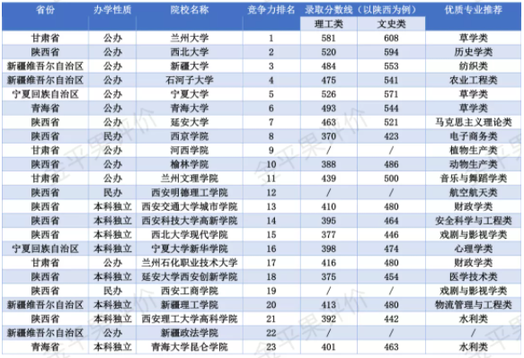 西北地區以陜西省的錄取分數線為例,分為理工類和文史類,其綜合類院校共23所。綜合競爭力排名第一的蘭州大學錄取分數線分別是581分(理工)和608分(文史),其優質推薦專業是草學類。綜合競爭力排名第二的是西北大學,該院校錄取分數線分別是520分(理工)和594分(文史),主要推薦專業是歷史學類。具體情況如下表所示。