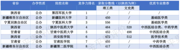 專家建議: 志愿填報是人生的一個重要選擇,涉及了院校選擇(發(fā)展城市)、專業(yè)選擇(競爭跑道)等。總體上建議考生應(yīng)結(jié)合自身的未來發(fā)展規(guī)劃、性格天賦、興趣導(dǎo)向來報考。但對不同分?jǐn)?shù)段考生,我們也提供了以下一些建議: 1、高分段(一般是一本線20分以上)學(xué)生建議以院校優(yōu)先考慮,爭取進(jìn)入實力較強(qiáng)的院校,專業(yè)如不滿意還可以爭取轉(zhuǎn)專業(yè)的機(jī)會。 2、中低分段(一般是本科線到一本線)學(xué)生建議專業(yè)優(yōu)先考慮,進(jìn)入一個自己有優(yōu)勢,與自己未來職業(yè)規(guī)劃更匹配的專業(yè),在擅長的領(lǐng)域?qū)崿F(xiàn)彎道超車。 3、無論采用哪種選擇策略,都要注意設(shè)置志愿方案的沖、穩(wěn)、保梯度,控制風(fēng)險。 4、獨(dú)立學(xué)院轉(zhuǎn)公的,分?jǐn)?shù)預(yù)計會上升;轉(zhuǎn)民辦的,分?jǐn)?shù)預(yù)計會有所下降;轉(zhuǎn)設(shè)方案未定的,可能會出現(xiàn)分?jǐn)?shù)波動,有可能出現(xiàn)撿漏的機(jī)會。 西北地區(qū)包括陜西省、甘肅省、青海省、寧夏回族自治區(qū)、新疆維吾爾自治區(qū)、內(nèi)蒙古自治區(qū)西部,共107所本科院校。其中,陜西省高校有55所。 西北地區(qū)以陜西省的錄取分?jǐn)?shù)線為例,分為理工類和文史類,其醫(yī)藥類院校僅有8所。綜合競爭力排名第一的第四軍醫(yī)大學(xué)。綜合競爭力排名第二的是新疆醫(yī)科大學(xué),主要推薦專業(yè)是基礎(chǔ)醫(yī)學(xué)類。具體情況如下表所示。 報考建議:位于500分左右的考生,謹(jǐn)慎選擇報考院校,謹(jǐn)防出現(xiàn)報考扎堆現(xiàn)象,建議擴(kuò)大報考院校地區(qū)或擴(kuò)展院校類型。不同分?jǐn)?shù)段的考生要綜合考慮城市+院校+專業(yè)組合的優(yōu)先順序,找出最優(yōu)解。致力于報考醫(yī)藥類院校的考生建議以自己感興趣的專業(yè)為優(yōu)先考慮因素。 西北地區(qū)醫(yī)藥類院校排名情況 ![]()