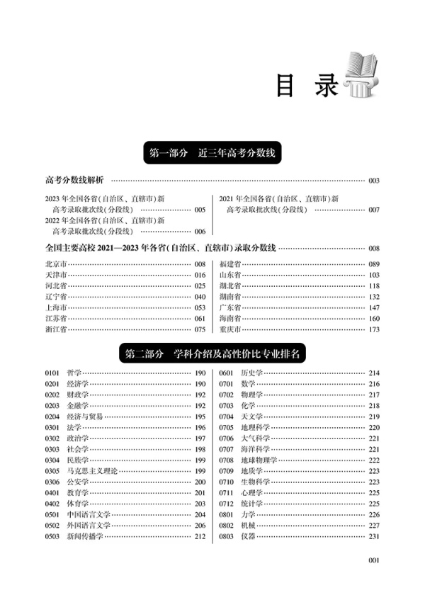 本書(shū)為武漢大學(xué)中國(guó)科學(xué)評(píng)價(jià)研究中心、“金平果”評(píng)價(jià)網(wǎng)等單位21年來(lái)對(duì)高考分?jǐn)?shù)線、大學(xué)評(píng)價(jià)及學(xué)科排名、高考政策的深度解析,全面把握全國(guó)14個(gè)新高考省(自治區(qū)、直轄市)1000多所本科院校的報(bào)考與錄取相關(guān)信息,匯集了高考學(xué)生填報(bào)志愿所必須了解的學(xué)科介紹及高報(bào)考性?xún)r(jià)比專(zhuān)業(yè)排名,結(jié)合填報(bào)志愿的政策前沿,為參加新高考的學(xué)生提供一份系統(tǒng)的權(quán)威報(bào)考指南,引導(dǎo)他們順利進(jìn)入“大學(xué)之門(mén)”。本書(shū)還可以成為中學(xué)領(lǐng)導(dǎo)及教師、高校領(lǐng)導(dǎo)及教師、招生人員了解高校招生情況的有力幫手,實(shí)時(shí)解答高考學(xué)生報(bào)考疑難。同時(shí),本書(shū)還能為教育研究院系/所和培訓(xùn)機(jī)構(gòu)、廣大教育工作者及社會(huì)各界人士提供高考數(shù)據(jù)和參考。