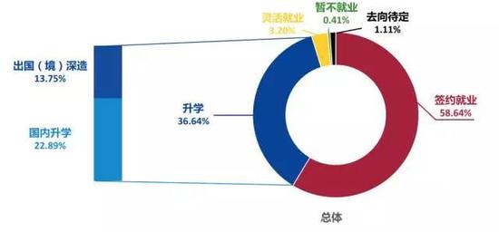 2017 年畢業(yè)生就業(yè)率為98.48%。其中,簽約就業(yè)比例為58.64%,國內(nèi)升學(xué)比例為22.89%,出國(境)深造比例為13.75%,靈活就業(yè)比例為3.20%,去向待定比例為1.11%,暫不就業(yè)比例為0.41%。