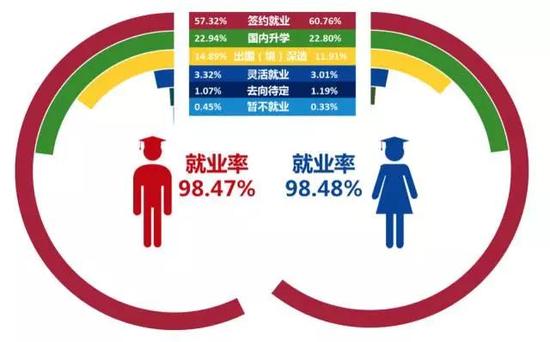 上海交通大學(xué)男生就業(yè)率98.47%,女生就業(yè)率98.48%。女生簽約就業(yè)比例高于男生,達到60.76%;而男生國內(nèi)升學(xué)和出國(境)深造的比例高于女生,靈活就業(yè)比例兩者較為接近。