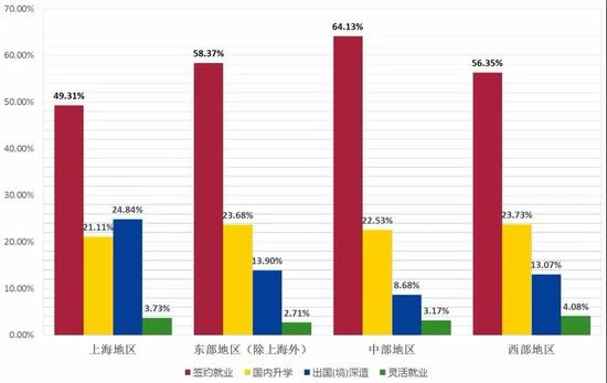 按生源地統(tǒng)計畢業(yè)去向,上海生源學(xué)生簽約就業(yè)比例為49.31%;東部各省市(除上海生源外)學(xué)生簽約就業(yè)比例為58.37%;中部各省市學(xué)生簽約就業(yè)比例為64.13%;西部各省市學(xué)生簽約就業(yè)比例為56.35%。