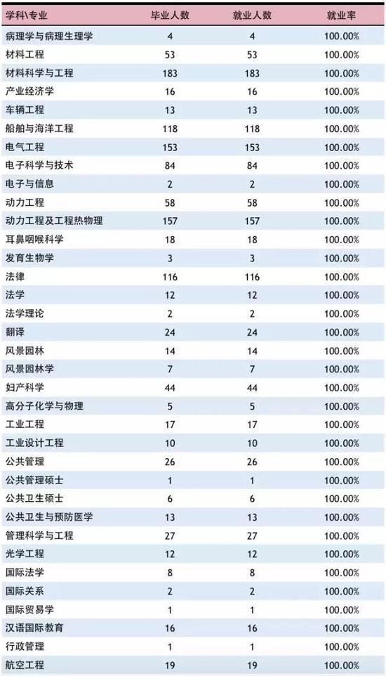![]() 從本科各專業(yè)來看,學(xué)校65個本科專業(yè)中,54 個專業(yè)的就業(yè)率達到了95% 以上,其中材料科學(xué)與工程、測控技術(shù)與儀器等36個專業(yè)的就業(yè)率達到了100% 。