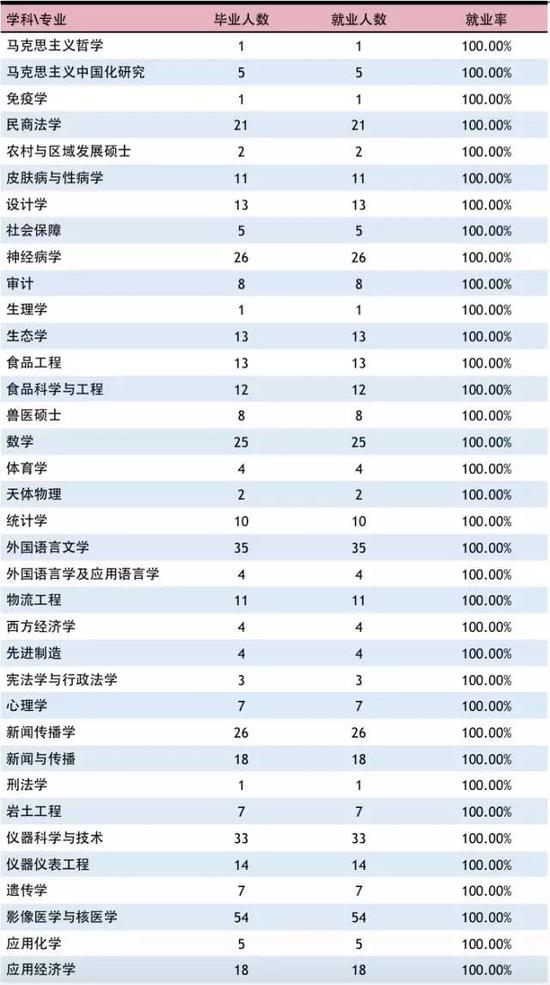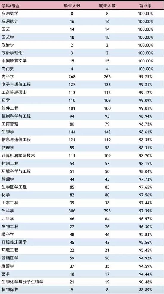 ![]() 從研究生各學(xué)科(專業(yè))來看,學(xué)校148個研究生學(xué)科(專業(yè))中,138個學(xué)科(專業(yè))的就業(yè)率達到95%以上,其中病理學(xué)與病理生理學(xué)、材料工程等115個研究生學(xué)科(專業(yè))的就業(yè)率達到了100% 。
