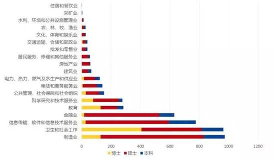 從就業(yè)單位所屬行業(yè)來看,上海交大畢業(yè)生就業(yè)最多的三個行業(yè)分別為:制造業(yè)、衛(wèi)生和社會工作以及信息傳輸、軟件和信息技術(shù)服務(wù)業(yè)。博士生到衛(wèi)生和社會工作就業(yè)的比例最高,碩士生到制造業(yè)就業(yè)的比例最高,本科生到信息傳輸、軟件和信息技術(shù)服務(wù)業(yè)就業(yè)的比例最高。