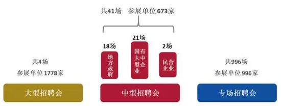 ![]() 2017年學(xué)校共計舉行1041場次各類招聘會,其中大型招聘會4場,國企集團、地方或行業(yè)類中型招聘會41場,小型招聘會996場(校級舉辦588場,院系承辦408場),共計到校招聘企業(yè)有3447家。