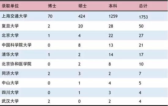 ![]() 除本校外,錄取上海交通大學(xué)畢業(yè)生人數(shù)排前三位的高校和科研院所分別是復(fù)旦大學(xué)(50 人)、北京大學(xué)(27 人)、中國科學(xué)院大學(xué)(21 人)。