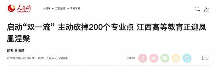 據人民網江西頻道今年1月報道,江西啟動了江西版高校“雙一流”建設,并明確將投入40億元,重點建設有特色高水平大學和一流學科專業。此外,為了解決高校專業設置沒有與市場有效對接的問題,江西還大刀闊斧進行改革,主動砍掉200多個專業點,江西高等教育正迎鳳凰涅槃。